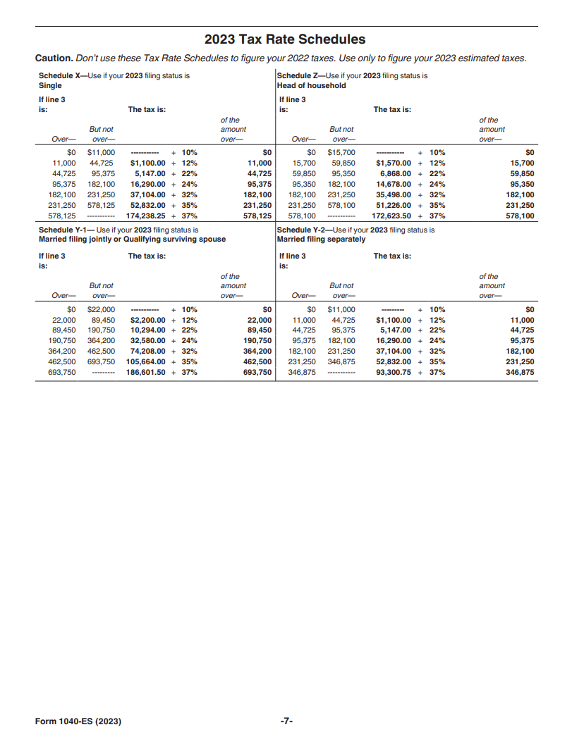 The tax schedule included in the instructions for Form 1040-ES lets you know how much income tax you should estimate for the year, based on what you’ve estimated for income: